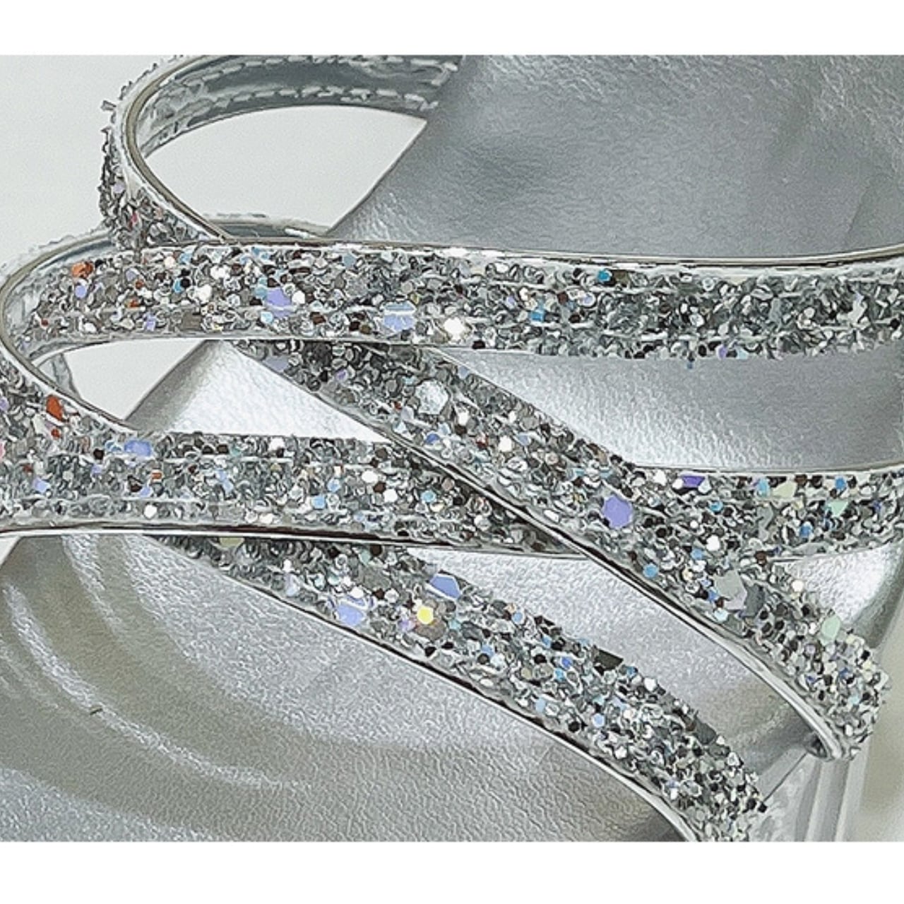 グリッタークロスデザインが華やかさを添え、プラットフォームヒールとアンクルストラップが安定感と洗練されたスタイルを演出します。
