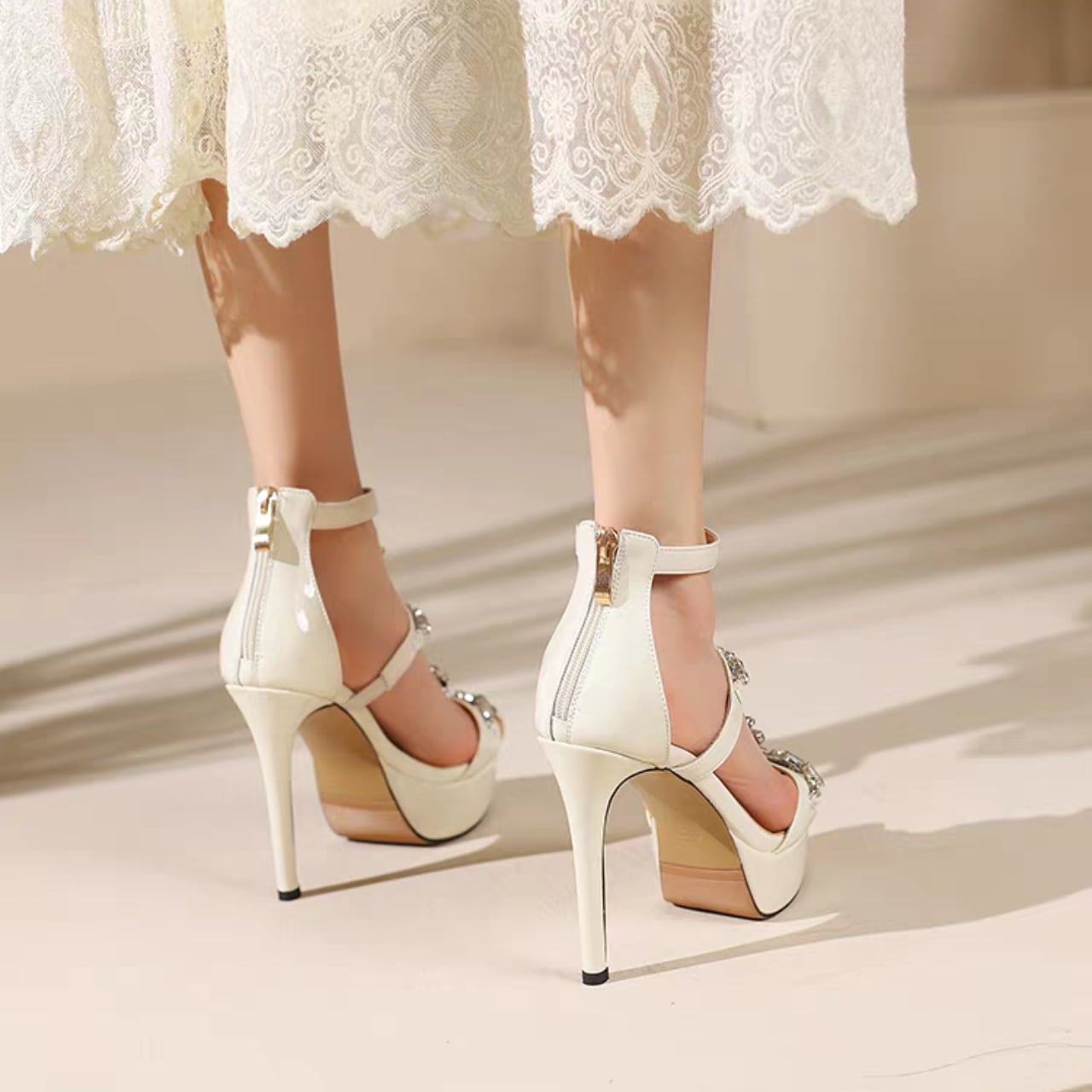 きらめくストーンが目を惹く、ハイヒールサンダル。