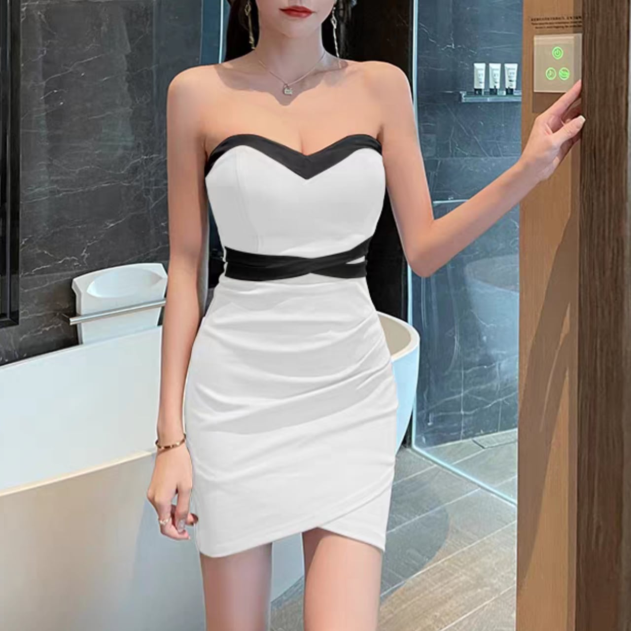 タイトなシルエットで女性らしいボディラインを美しく演出します。