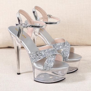 クロスストラップとクリアヒールが洗練された印象を与えるプラットフォームハイヒール。