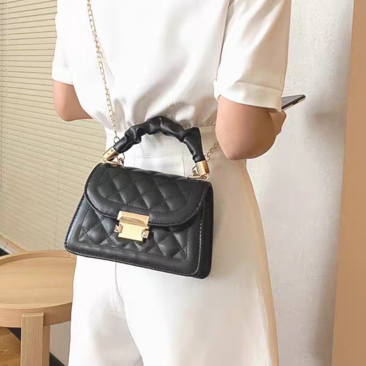 キルティングの美しい輝きと、ツイストされた上品なハンドルが魅力のミニバッグ。