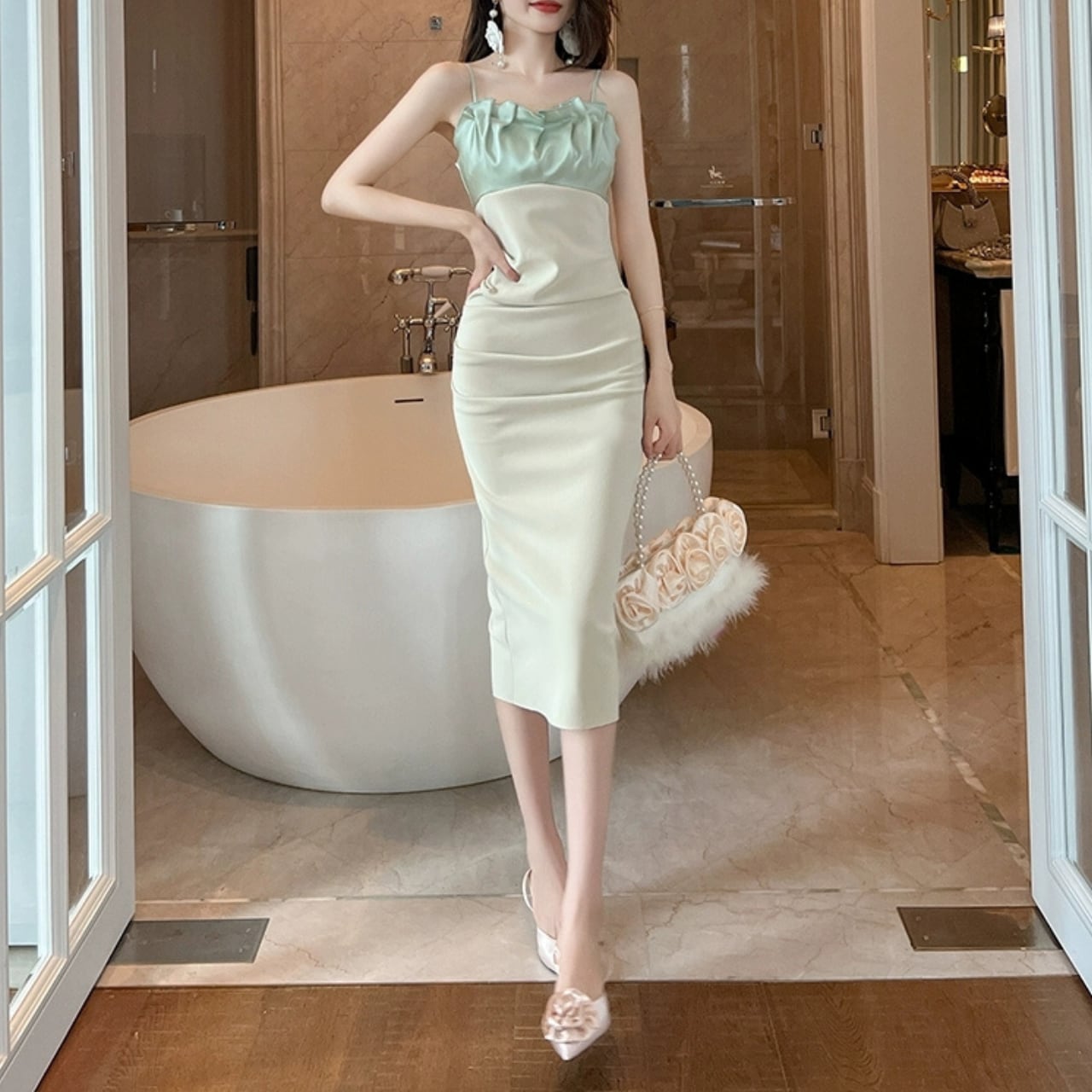 洗練されたシルエットと上品な光沢が魅力のマーメイドタイトミディアムドレス。