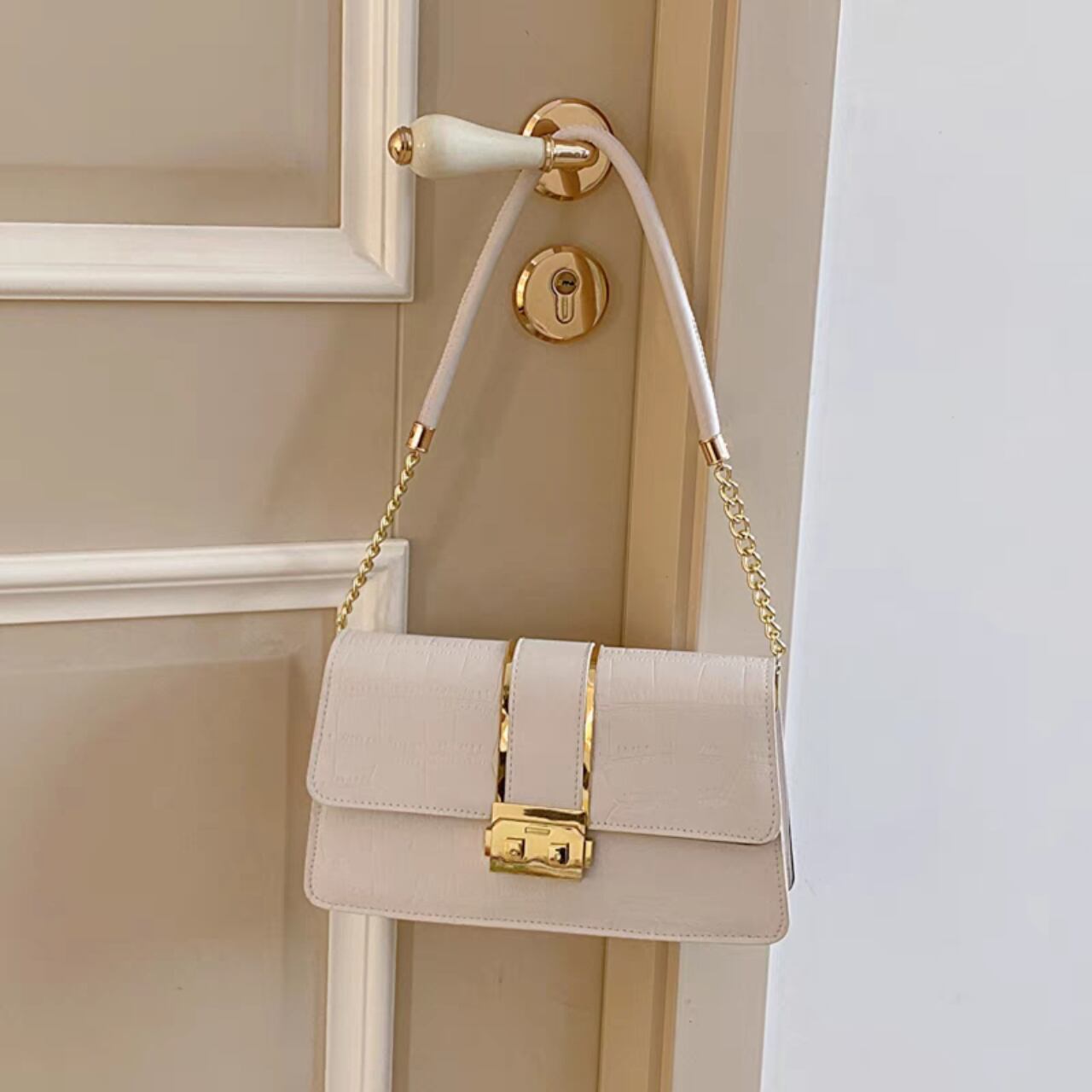 洗練されたクロコダイル型押しとゴールド金具が上品な輝きを放つショルダーバッグ。