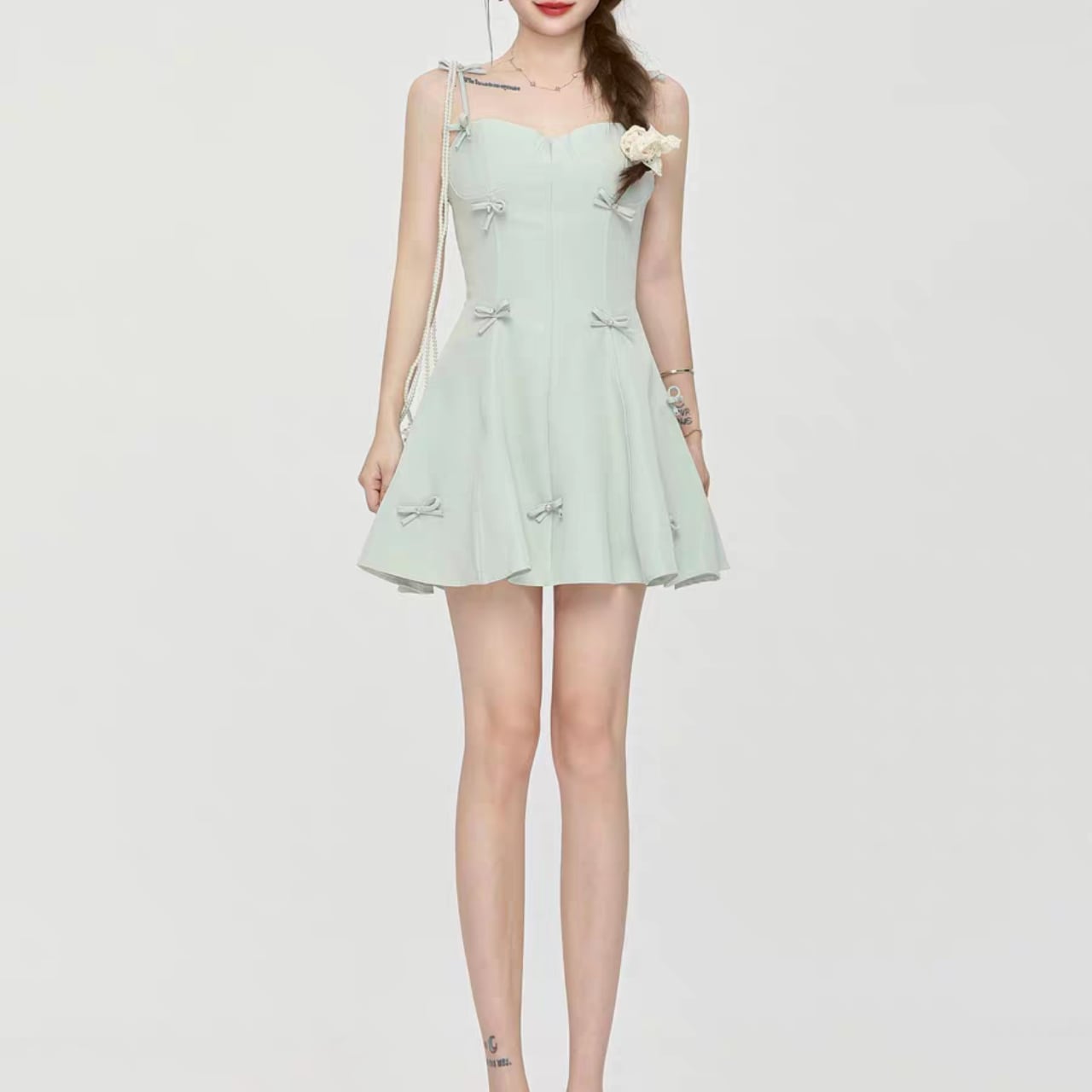 洗練されたデザインと可愛らしさを兼ね備えた、キャミソールミニドレス。